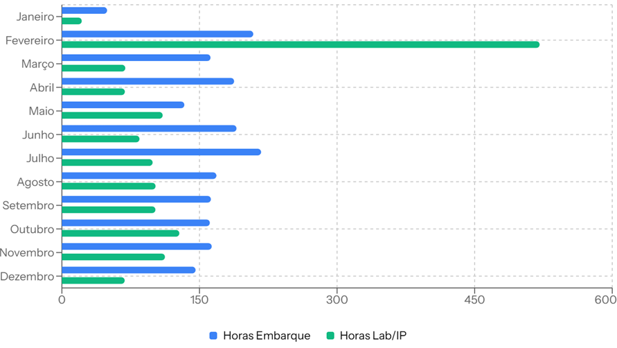Horas gastas por mês (ano de 2025) com agendamento de embarques , coleta , manipulação e atividades relacionadas a coletas de laboratórios centrais. *